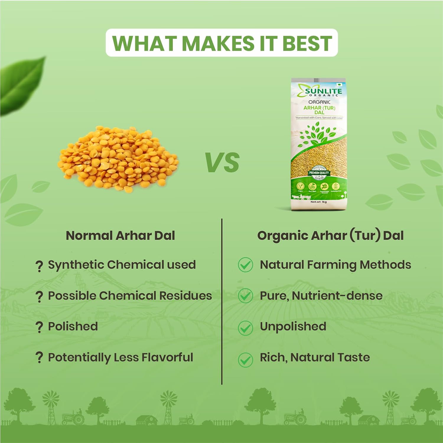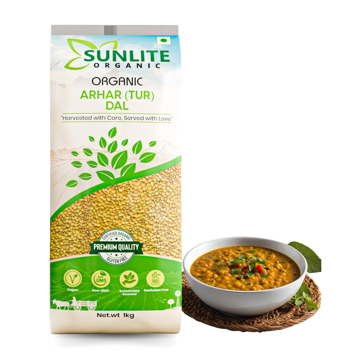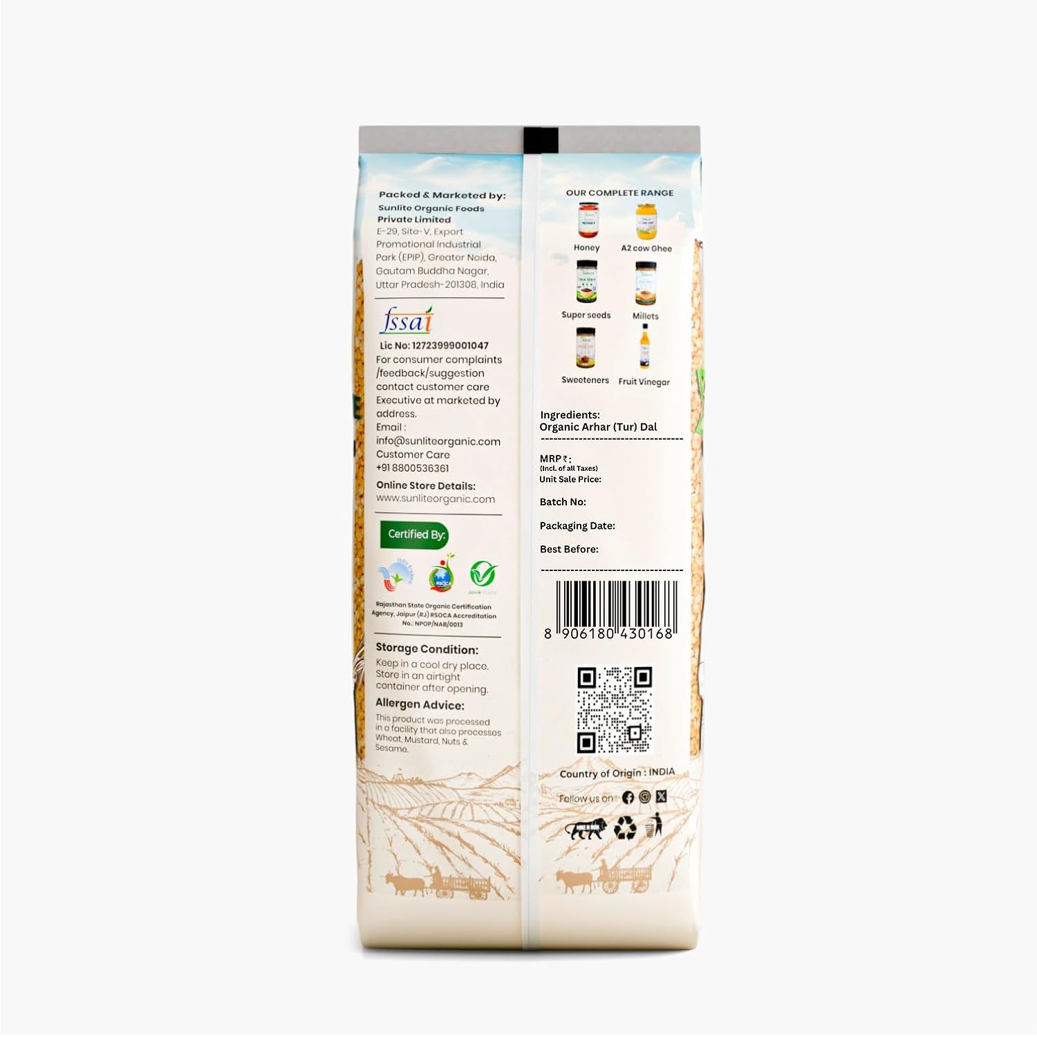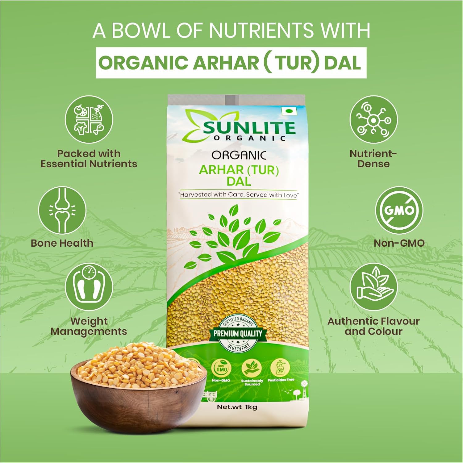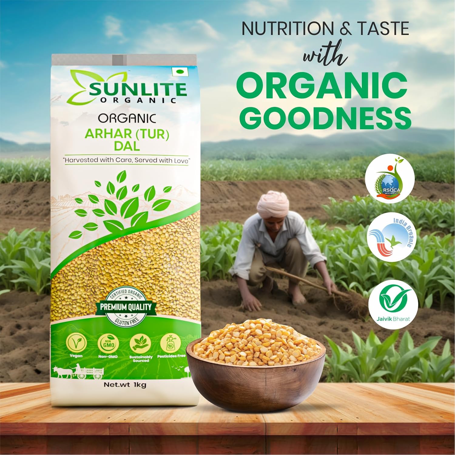 Organic Certification: Sunlite Organic's Arhar (Tur) Dal is 100% Organic Certified, ensuring it is grown without synthetic pesticides or fertilisers.